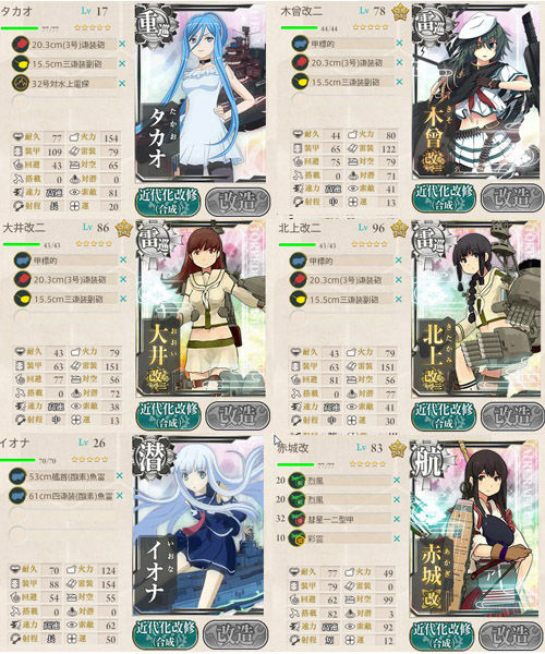 イオナ、タカオが主戦力となる。二人が強力なため、それ以外に必須艦種は無い。