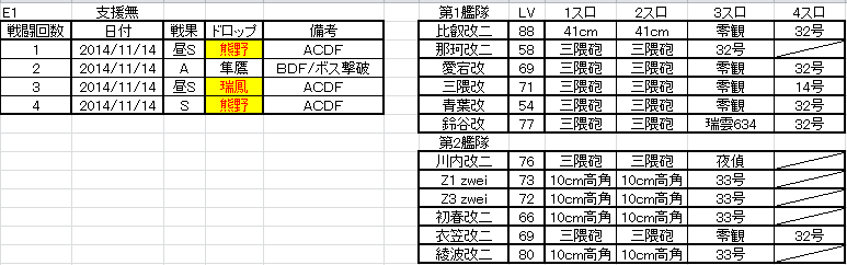 支援艦隊の仕様については(WIKI)を参照。E-1では、低レベル、または雷巡が使えない際に使用すると良いでしょう。